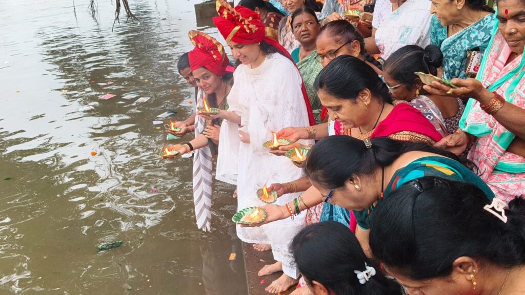 यावेळी मोठ्या उत्साहाने सर्वांनी प्रवारा नदीचे जलपूजन करून या ठिकाणी आरती केली. याचबरोबर सर्व महिलांनी विधिवत पूजा करून प्रवरा नदीला दिवे अर्पण केले.