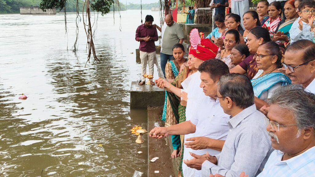 प्रवरानदीतीरावर गंगामाई घाटावर येथे प्रवारा नदीचे जल पूजन व आरती करण्यात आली. याचबरोबर म्हाळुंगी नदीला साडी चोळी अर्पण करण्यात आली. यावेळी मा आ डॉ सुधीर तांबे, डॉ जयश्रीताई थोरात ,डॉ मैथिलीताई तांबे, काँग्रेसचे शहराध्यक्ष सोमेश्वर दिवटे, तालुकाध्यक्ष अजय फटांगरे, गणेश मादास, अंबादास आडेप, लक्ष्मण बर्गे, ॲड अजित काकडे, सौ प्रमिला अभंग, ॲड मुन्ना कडलक, चंद्रकांत कडलक, बाळासाहेब पवार, शैलेश कलंत्री, सुमित पवार ,आदित्य बर्गे ,चंद्रकांत काळन, एकनाथ श्रीपत, सौ प्रीती फटांगरे ,मिलिंद आवटी, सौ सुषमा भालेराव, सौ सुनीता कांदळकर, आदींसह युवक कार्यकर्ते मोठ्या संख्येने उपस्थित होते.