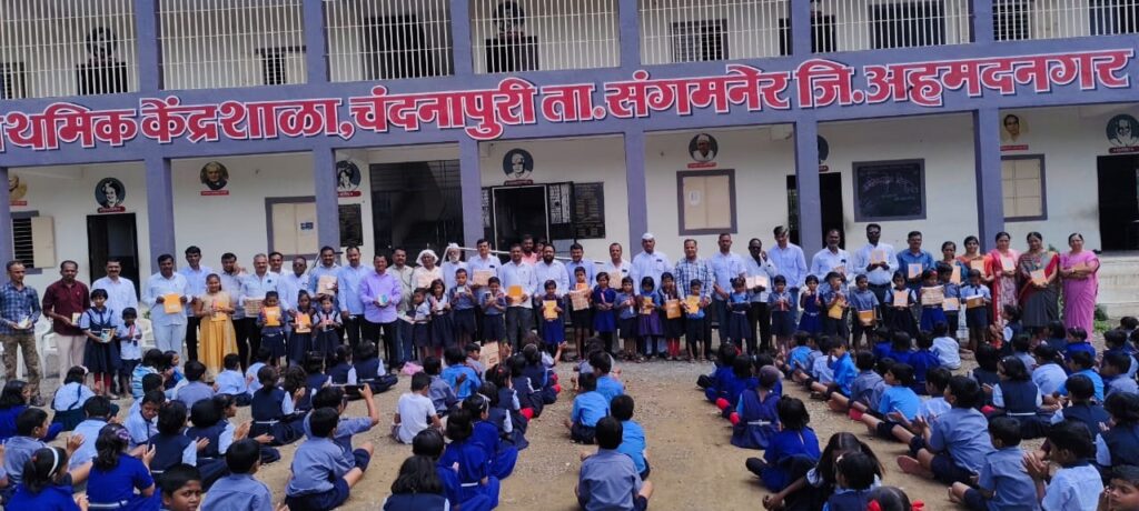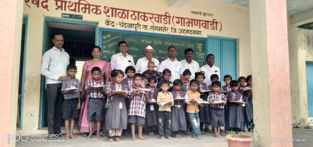 त्याचाच एक भाग म्हणून चंदनापुरी येथील जिल्हा परिषदेच्या शाळेत आमदार अमोल खताळ यांच्या कार्यालयाच्यावतीने देण्यात आलेले शालेय साहित्य आणि शिवसेनेचे तालुकाप्रमुख रामभाऊ रहाणे, युवासेना प्रमुख सुशील शेवाळे विलास सरोदे व अमोल रहाणे यांनी स्व खर्चातून वह्या व इतर शालेयपयोगी साहित्य खरेदी करून जिल्हा परिषदेच्या चंदनापुरी,आनंदवाडी,जावळेवस्ती व ठाकरवाडी या जिल्हा परिषदेच्या शाळेतील सर्वच विद्यार्थ्यांना वितरित केले.