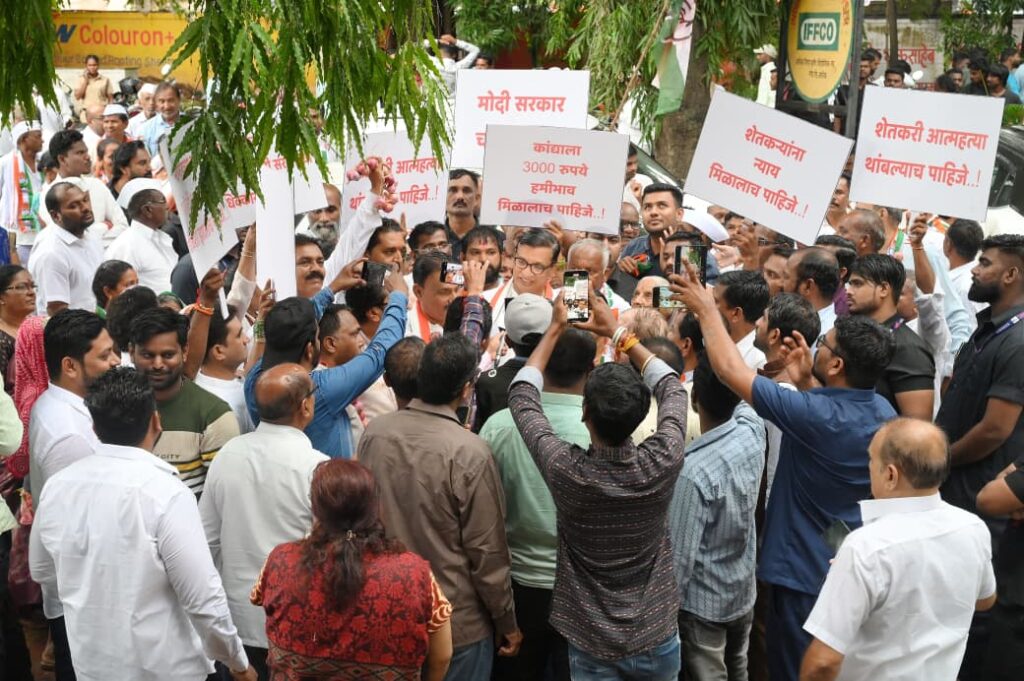 कांद्याला हमीभाव मिळावा. नाफेड कांदा खरेदी गैर प्रकारातील चौकशी व्हावी याकरता माजी मंत्री बाळासाहेब थोरात यांच्या नेतृत्वाखाली काँग्रेसच्या वतीने भव्य आंदोलन करण्यात आले भर पावसामध्ये या आंदोलन सुरू होते. यावेळी केंद्र व राज्य सरकार विरोधात घोषणांनी परिसर दुमदुमून गेला या आंदोलनामध्ये शेतकऱ्यांची मोठी लक्षणीय उपस्थिती होती.