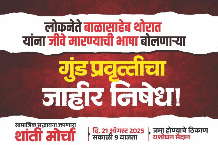 यशवंतराव चव्हाण यांचे वारसदार अशी ओळख असलेले महाराष्ट्राचे सुसंस्कृत नेते बाळासाहेब थोरात यांना धमकी देणाऱ्या तथाकथित कीर्तनकार संग्राम भंडारे यांच्या निषेधार्थ व संगमनेर मध्ये अशांतता निर्माण करणाऱ्या जातीयवादी शक्ती विरोधात तमाम संगमनेरकर हिंदू समाज, विविध पुरोगामी संघटना, अध्यात्मिक मंच, महाविकास आघाडी यांच्या वतीने गुरुवार 21 ऑगस्ट 2025 रोजी सकाळी 9 वा. भव्य सद्भावना शांती मोर्चा होणार असल्याची माहिती काँग्रेसचे तालुकाध्यक्ष अजय फटांगरे व विविध संघटनांच्या पदाधिकाऱ्यांनी दिली आहे.