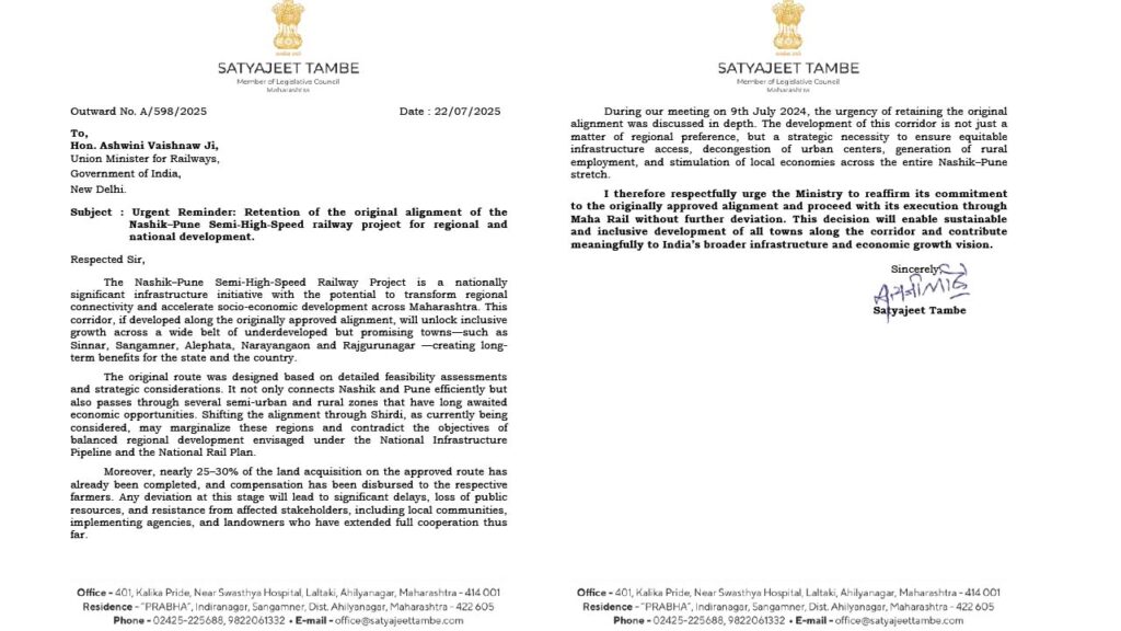 नाशिक–पुणे सेमी हायस्पीड रेल्वे प्रकल्प हा महाराष्ट्राच्या प्रादेशिक तसेच राष्ट्रीय विकासासाठी अत्यंत महत्त्वाचा ठरणारा उपक्रम आहे. या प्रकल्पाचा मूळ मंजूर मार्ग कायम ठेवण्याची तातडीची गरज असल्याचे सांगत आमदार सत्यजीत तांबे यांनी केंद्रीय रेल्वेमंत्री अश्विनी वैष्णव यांना स्मरणपत्र दिले आहे.