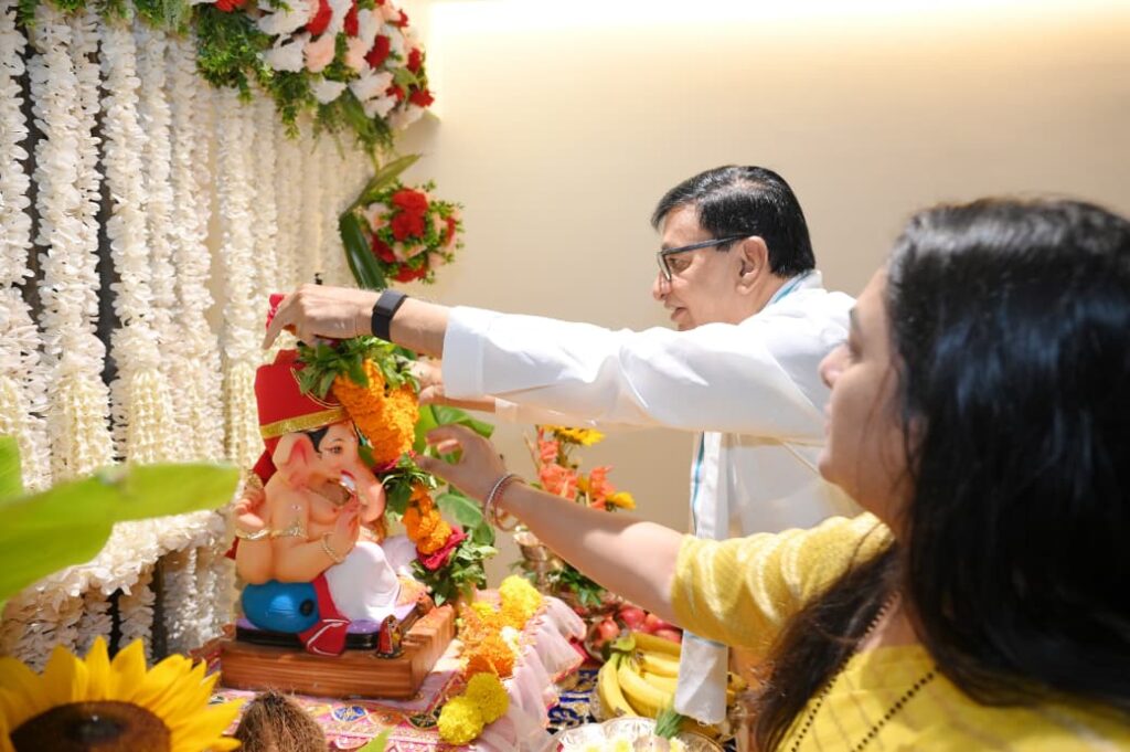 मा.आ.डॉ.सुधीर तांबे यांच्या प्रभा निवासस्थानी गणेशाची आरती करण्यात आली. यावेळी समवेत सौ.कांचनताई थोरात, मा.आ.डॉ.सुधीर तांबे, सौ.दुर्गाताई तांबे, आमदार सत्यजित तांबे, डॉ. मैथिलीताई तांबे, डॉ.वर्षा तांबे,विजय राहणे, शरद बटवाल,बाबासाहेब कडनर, नितीन अभंग, ज्ञानेश्वर राक्षे यांच्यासह संगमनेर शहरातील कार्यकर्ते व पदाधिकारी मोठ्या संख्येने उपस्थित होते.
