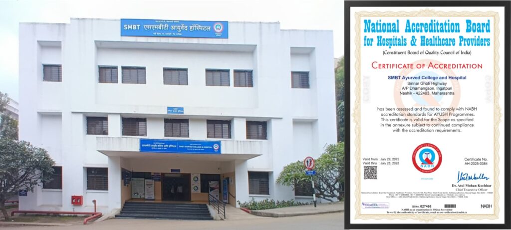 नाशिक जिल्ह्यातील आणि इगतपुरी तालुक्यातील एसएमबीटी आयुर्वेद हॉस्पिटलला नुकतेच नॅशनल अॅक्रिडेशन बोर्ड फॉर हॉस्पिटल्स ॲण्ड हेल्थकेअर प्रोव्हायडर्स (एनएबीएच) मानांकन प्राप्त झाले. ‘एनएबीएच’ची मान्यता प्राप्त करणे या हॉस्पिटलमध्ये झालेल्या काळानुरूप बदलाची पावती असून दर्जेदार रुग्णसेवा आणि सुरक्षितता प्रदान करण्याच्या हॉस्पिटलच्या वचनबद्धतेचा हा दाखला असल्याचे वैद्यकीय संचालक तथा प्राचार्य डॉ. प्रदीप भाबड यांनी सांगितले. एनएबीएच मानांकन प्राप्त झाल्यानंतर ते संवाद साधत होते.