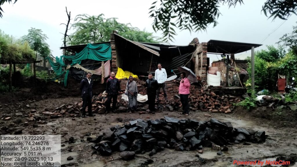 २७ सप्टेंबरपासून जिल्हाभरात काही ठिकाणी संततधार तर काही ठिकाणी मुसळधार पाऊस कोसळतोय, या पावसामुळे अनेक ठिकाणी शेतीपिकांबरोबरच घरांचंही मोठं नुकसान झालंय. संगमनेर तालुक्यातील पारेगांव बुद्रुक येथे रात्री पावसामुळे अतिशय गरीब परिस्थिती असलेल्या कुटुंबाचं राहतं घर पडलंय. आज पहाटे तीन वाजण्याच्या सुमारास हि दुर्घटना घडली असून सुदैवाने यात कोणतीही जीवितहानी झाली नाही मात्र संसारोपयोगी साहित्याचं मोठं नुकसान झालंय. गावामध्ये निमोण रस्त्याच्या शेजारी राहणाऱ्या गंगुबाई जनार्दन घोटेकर आणि शकुंतला वर्पे या दोघी बहिणींच्या घराची भिंत जमीनदोस्त झाल्याची घटना घडली आहे.