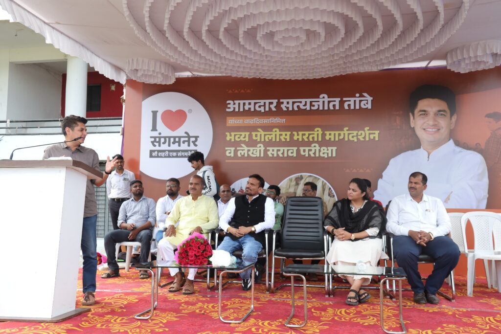 सहकार महर्षी भाऊसाहेब थोरात क्रीडा संकुल येथे आय लव संगमनेर चळवळीच्या वतीने आमदार सत्यजित तांबे यांच्या वाढदिवसानिमित्त पोलीस सराव परीक्षेचे आयोजन करण्यात आले यावेळी ते बोलत होते. या सराव परीक्षेमध्ये 2022 युवक व युवतींनी सहभाग घेतला यावेळी व्यासपीठावर माजी आमदार डॉ सुधीर तांबे, आयोजक आमदार सत्यजित तांबे, सौ दुर्गाताई तांबे, डॉ. मैथिलीताई तांबे, तसेच रॉयल अकॅडमी, साई करिअर अकॅडमी, आर्यस अकॅडमी नाशिक, शौर्य अकॅडमी, जय हिंद अकॅडमी , ज्ञानराज अकॅडमी, आर्या अकॅडमी, एस के अकॅडमी व मातोश्री अकॅडमीचे संचालक उपस्थित होते. यावेळी सर्व विद्यार्थ्यांची लेखी सराव परीक्षा घेण्यात आली.