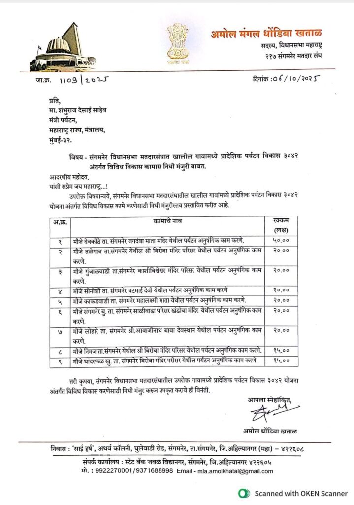 जगदंबा माता मंदिराच्या सुशोभीकरणासाठी मंजूर झालेल्या 50 लाख रुपयांच्या निधीचे श्रेय आमदार अमोल खताळ यांचेच आहे. हा निधी मिळण्यासाठी सर्व कागदपत्रांची पूर्तता करत प्रस्ताव तयार करून जिल्हाधिकारी यांच्याकडे पाठवला. तिथून पुढे तो मंत्रालयात गेला परंतु विधानसभा निवडणूक आचारसंहितेमुळे तो प्रलंबित होता मात्र आमदार अमोल खताळ यांनी पर्यटन विकास मंत्री शंभूराज देसाई यांच्याकडे सतत पाठपुरावा केला असल्यामुळेच हा निधी मजूर झाला आहे.