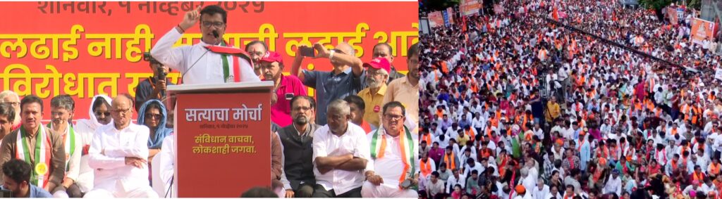 मुंबई येथे महाविकास आघाडी व मित्र पक्षांच्या वतीने केंद्रीय निवडणूक आयोग व राज्य निवडणूक आयोगाच्या विरोधात भव्य सत्याचा मोर्चा करण्यात आला यावेळी ते विराट मोर्चात बोलत होते याप्रसंगी व्यासपीठावर देशाचे ज्येष्ठ नेते खासदार शरदचंद्रजी पवार, माजी मुख्यमंत्री उद्धव ठाकरे, मनसे प्रमुख राज ठाकरे, ज्येष्ठ नेते जयंत पाटील, आदित्य ठाकरे, खासदार अरविंद सावंत, काँग्रेसचे आमदार विजय वडेट्टीवार, बंटी पाटील, भाई जगताप, किसान सभेचे ॲड अजित नवले यांच्यासह राज्यभरातील विरोधी पक्षांचे प्रमुख नेते उपस्थित होते.