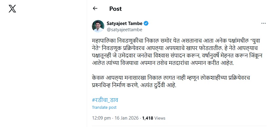 आमदार तांबे यांनी आपल्या ट्विटमध्ये म्हटले आहे की, “महापालिका निवडणुकीचा निकाल समोर येत असतानाच अनेक पक्षांमधील ‘युवा नेते’ आपल्या अपयशाचे खापर थेट निवडणूक प्रक्रियेवर फोडत आहेत. हे नेते आपल्या पक्षातीलच त्या उमेदवारांचा अपमान करत आहेत, ज्यांनी वर्षानुवर्षे मेहनत करून जनतेचा विश्वास संपादन केला आणि निवडणुकीत विजय मिळवला.”