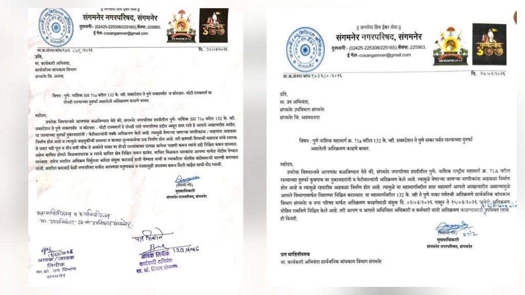 या पार्श्वभूमीवर संगमनेर नगरपालिकेने सार्वजनिक बांधकाम विभागाला दिनांक 12 मार्च 2026 रोजी दोन सविस्तर पत्रे देऊन संबंधित रस्त्यांच्या हद्दी निश्चित करणे, बाधित मिळकतधारकांची माहिती तयार करणे, त्यांना नोटिसा बजावणे तसेच अतिक्रमण हटविण्यासाठी संयुक्त मोहीम राबविण्याची मागणी करण्यात आली होती.